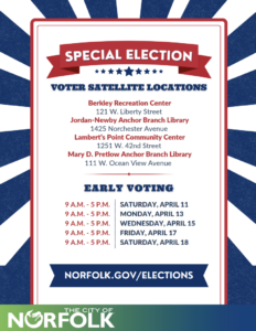 - Early voting for the April 21, 2026 Special Election will begin on Friday, March 6th at 9:00 a.m. in the Norfolk Office of Elections.
